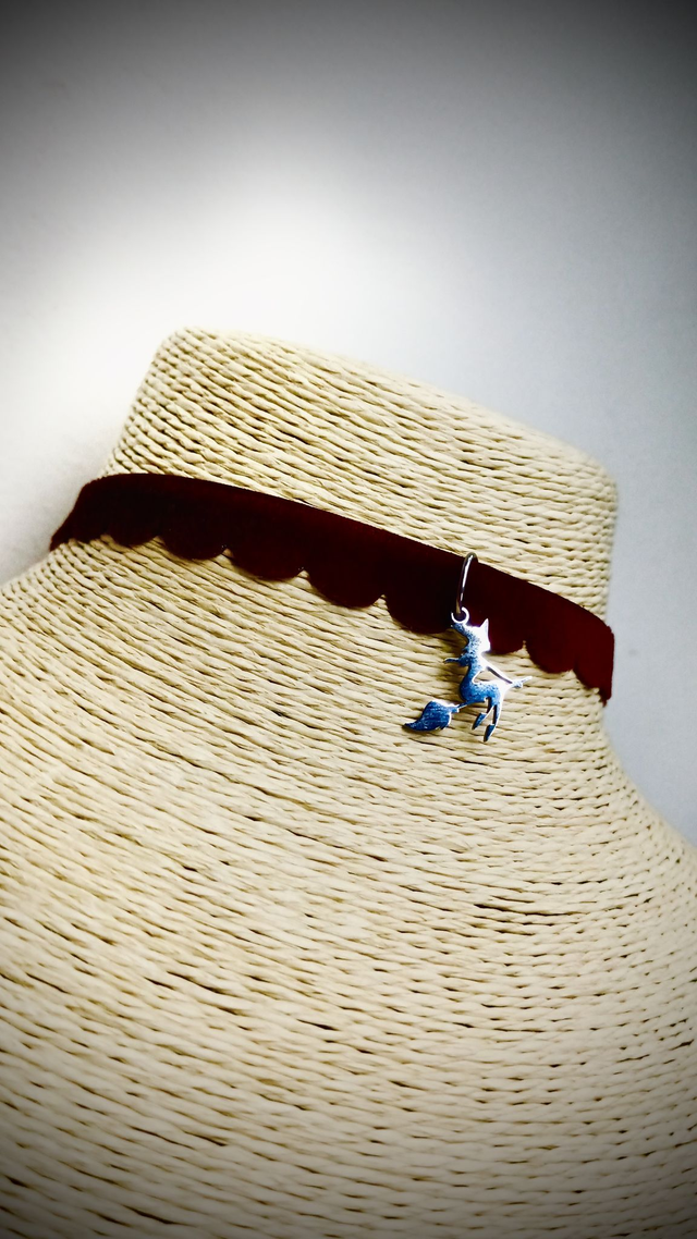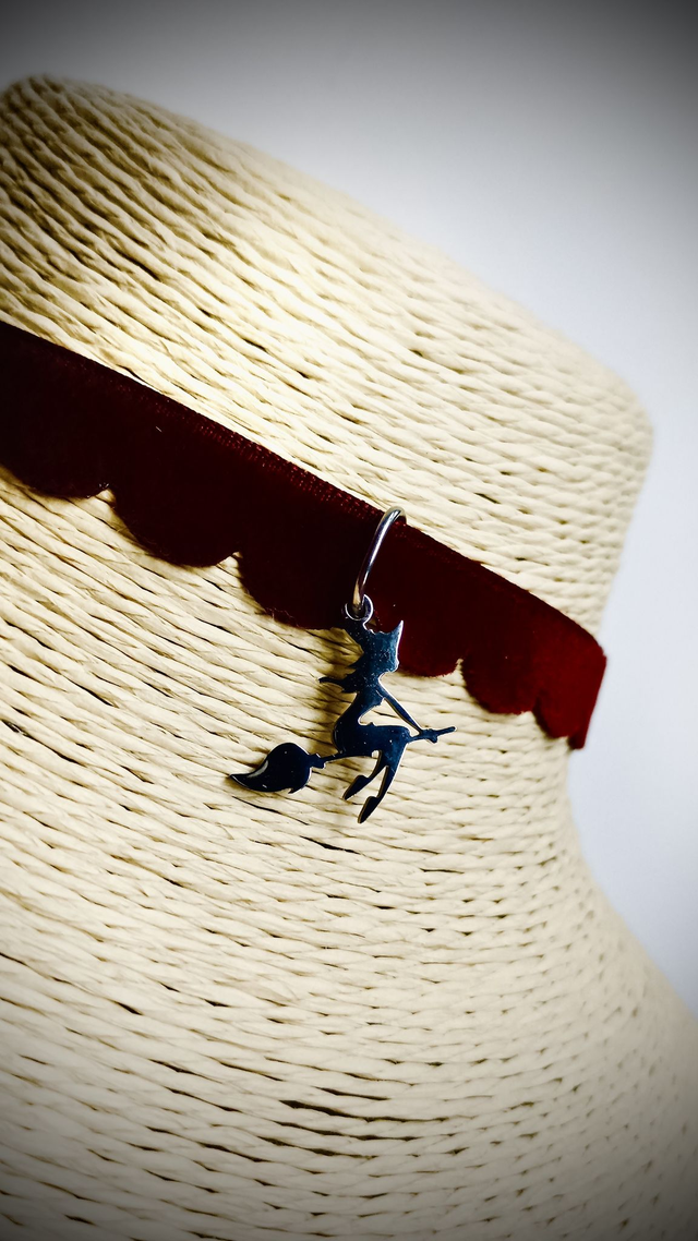 Ce magnifique ras-du-cou de la collection Empowering Halloween est réalisé en velours rouge profond et orné d'une breloque en acier inoxydable représentant une sorcière volant sur son balais. Disponible en doré et argenté.